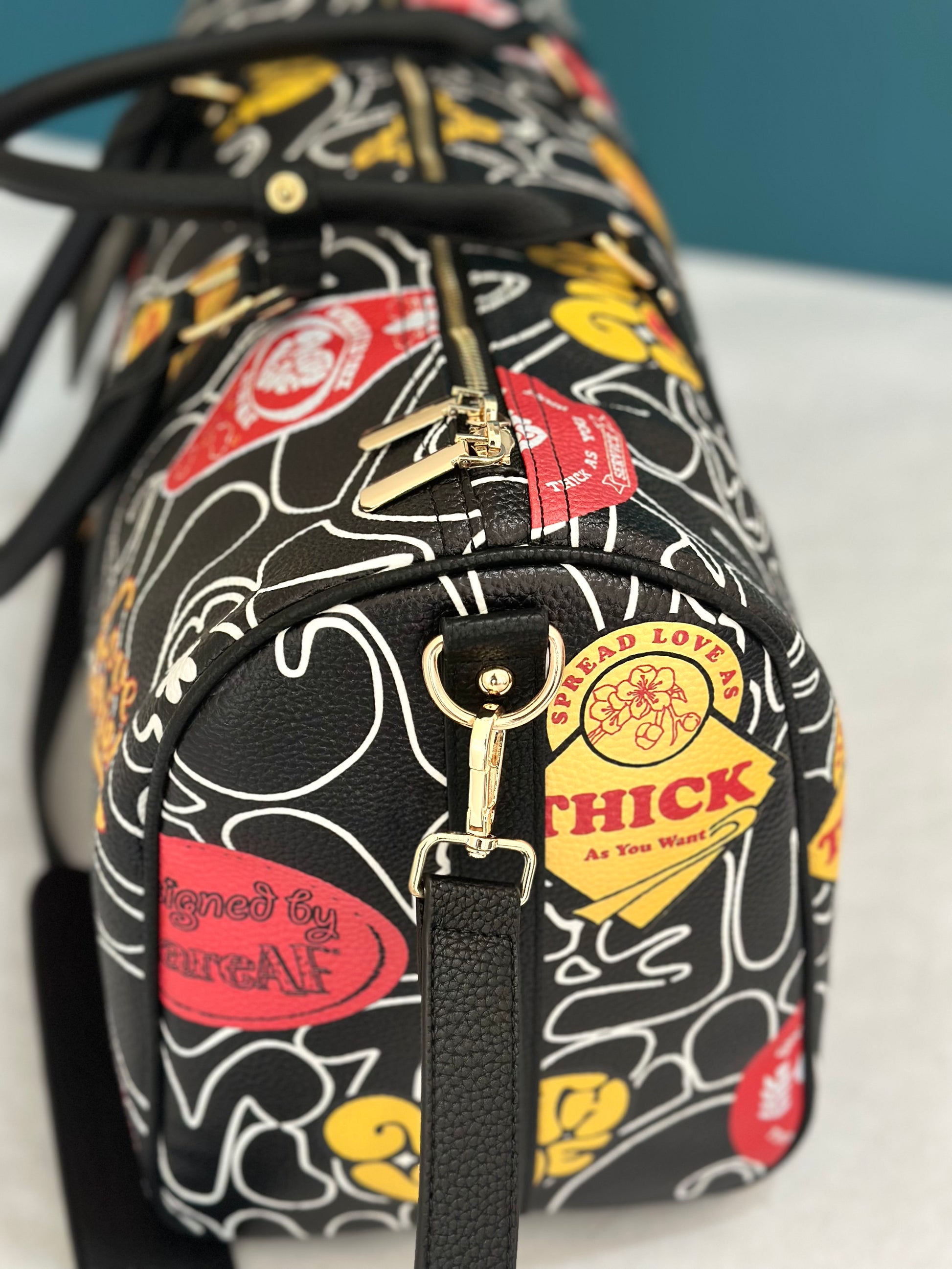 Made with 100% leather. Size; 20*10*8 inch. This duffle bag's structured is made from co leather with colorful layers and gold trims. We use our WithLOVE print outline as the background print, than took all the element of the brand and created printed patch design as the layer. This travel bag is build for you to live with.